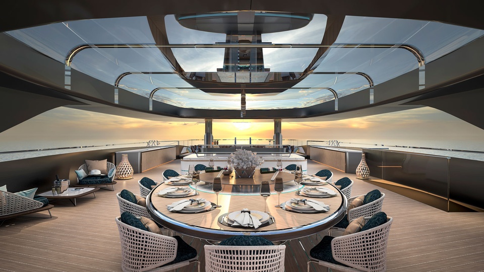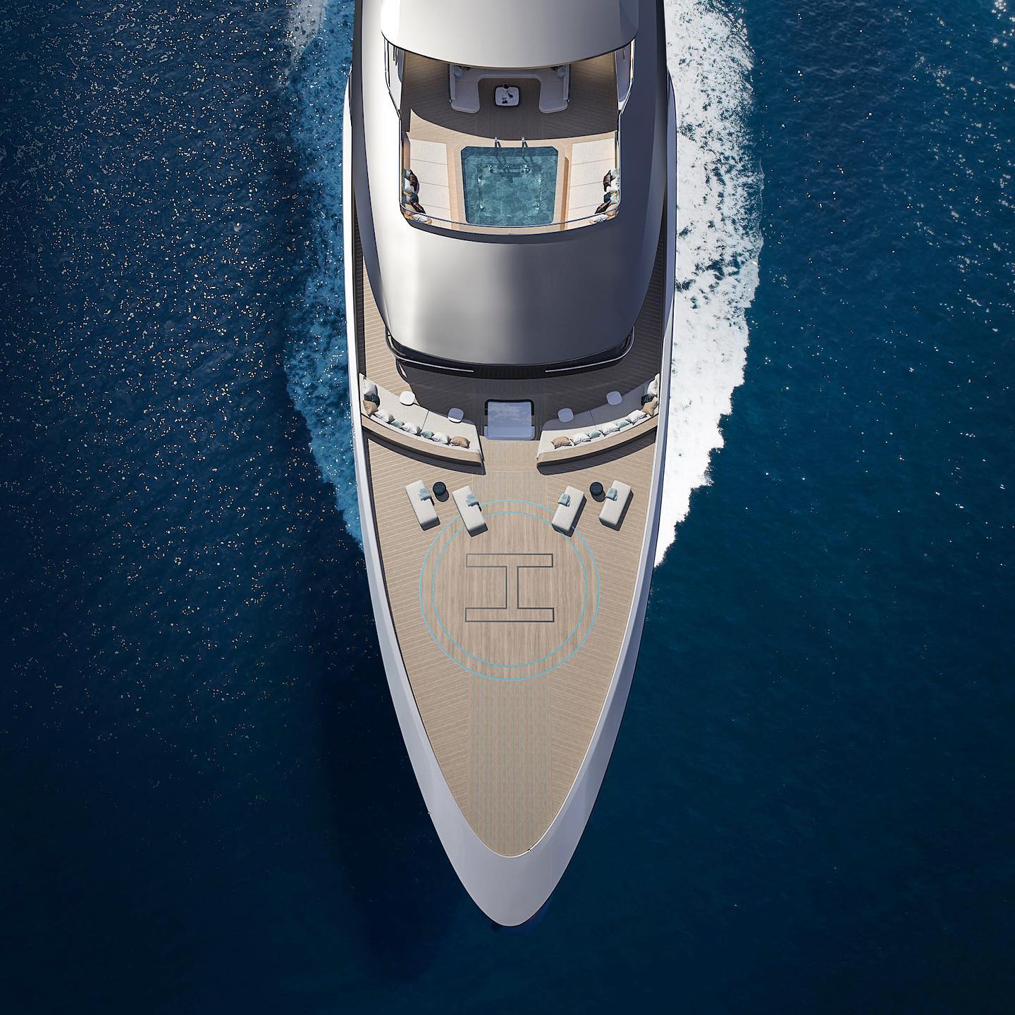 According to SFG Yacht Design the exterior features “smooth long flowing lines and clean shapes” and has the main deck swimming pool with a swim-up bar and glass floor. The touch and go helipad sits forward of the bridge deck.