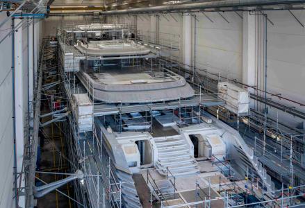 “With the well-executed trompe l’oeil effect, your eye tells you it is real timber,” says Matthew Wilkinson, project manager at Winch Design. The luxury superyacht is made of steel and aluminum. But the wood in her central stairwell is a veneer over aluminum. “Certain areas aboard governed by these regulations have to be flame retardant and have to allow for watertight compartments and escape routes, both in the guest accommodations and in the engine room,” says Dietrich Kirchner, project manager at Lürssen.